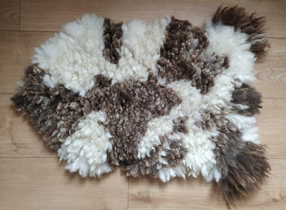 Home / Felted Fleece Rugs / Felted-fleece, sheep-friendly “sheepskin” mini rug – cream & brown – Jacob – 24” x 16” / sheep-friendly sheepskin rug – Jacbo face up