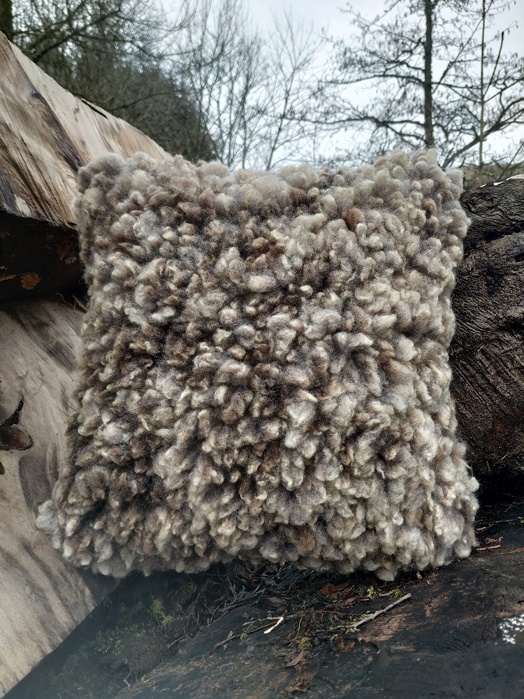 Home / Felted Fleece Cushions / Felted fleece, sheep friendly “sheepskin” cushion, natural shades of caramel, brown & grey – Coloured Ryeland wool from Pinkie / sheep-friendly sheepskin cushion – front – Coloured Ryeland – Pinkie