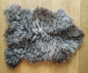 Home / Felted Fleece Rugs / Felted-fleece, sheep-friendly “sheepskin” rug – natural shades of grey & brown – Cheviot fleece – 33 x 21” / sheep friendly sheepskin rug – dark woolled Cheviot – face up