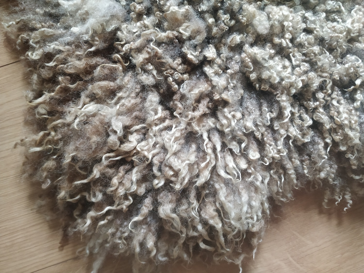 Home / Felted Fleece Rugs / Felted-fleece, sheep-friendly, “sheepskin” rug – natural shades of beige & brown, including emerald green patch of marker spray stain – Coloured Scotch Mule fleece – 29” x 23” / felted fleece rug-Coloured Scotch Mule-close up..