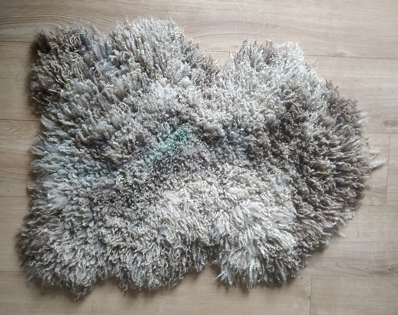 Previous post: Felted-fleece, sheep-friendly, “sheepskin” rug – natural shades of beige & brown, including emerald green patch of marker spray stain – Coloured Scotch Mule fleece – 29” x 23”