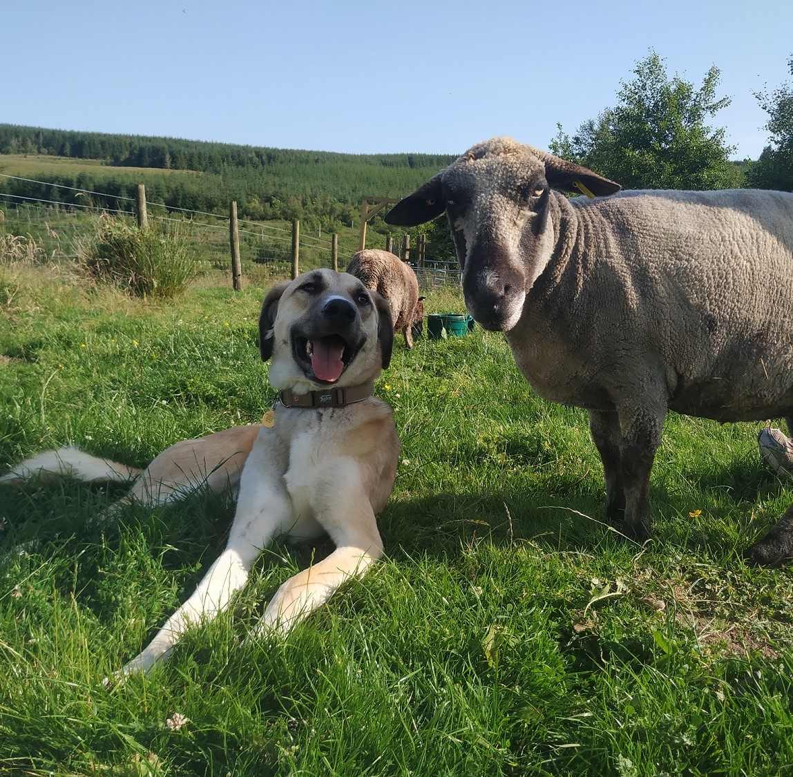 Elliot joined our family in May. He’s a rescue dog and came from Turkey in a van with 10 other dogs, all going to forever homes in the UK. Elliot is a Turkish Anatolian Shepherd cross and is happiest mooching about with the sheep. He’s struck up a real friendship with Selene the flock leader who you can see in the photo.