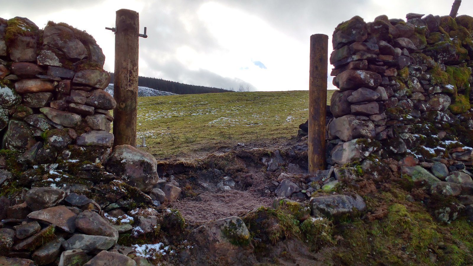 new gateway in dry stone dykeHowever, there are a few bits of wall that need repair.  Last year, I did a course which gave me a basic grounding in how to build stone dykes.  One freezing and snowy day last winter, Nicole and I put this into practice by putting a gate inbetween two fields.  The course hadn’t covered how to do the ends of the walls, but we just copied what we saw elsewhere – basically use big stones.