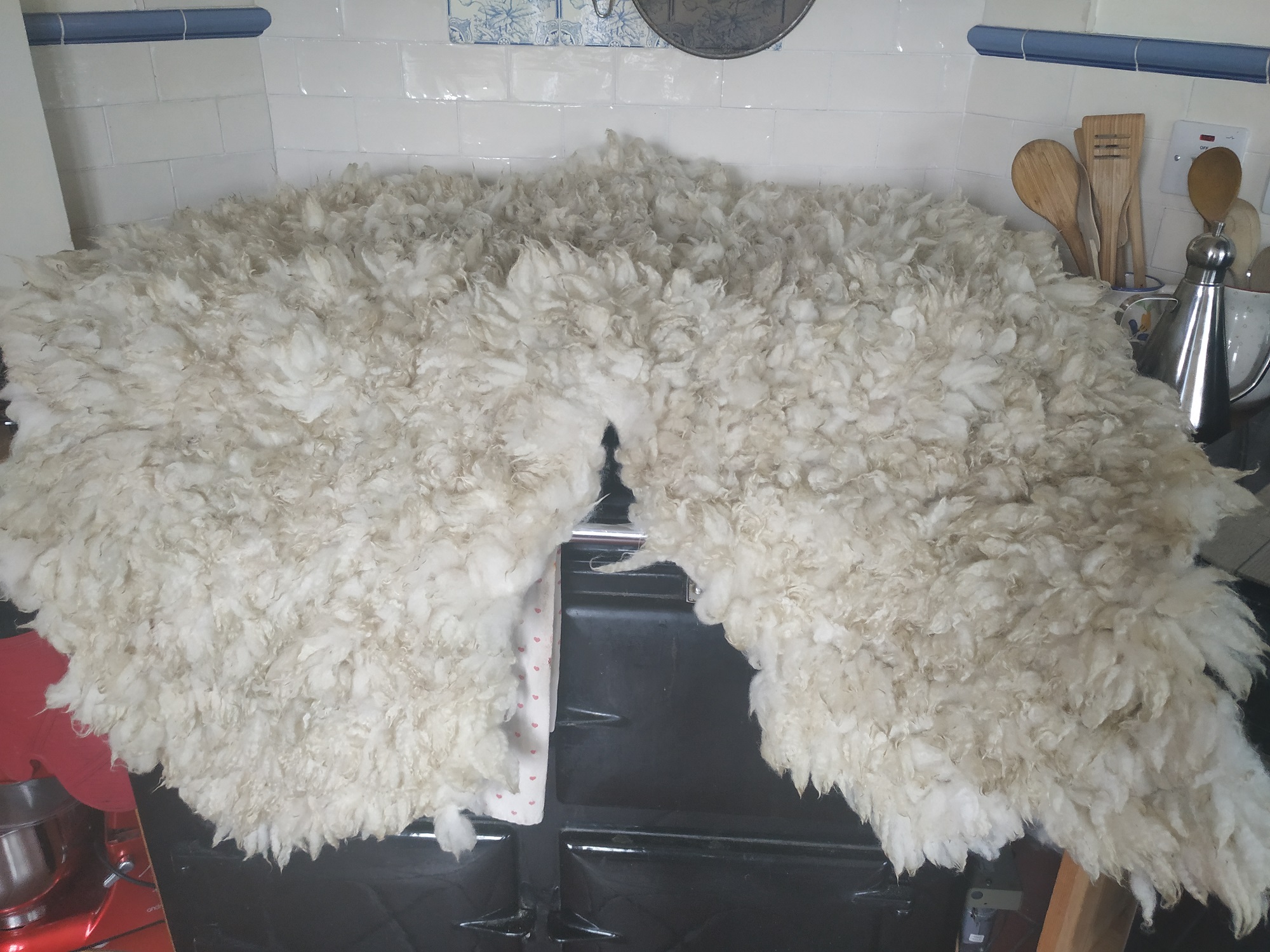 So, armed with the perfect fleece, complete with purple paint spray on the bottom, I set about preparing it.  This means going through the fleece and selecting the nicest looking locks.  Not all locks are the same in one fleece, some are matted, prone to breakage, badly sheared, or just plain “manky”!  I like to cherry pick my locks so that only the nicest go into what I’m making.