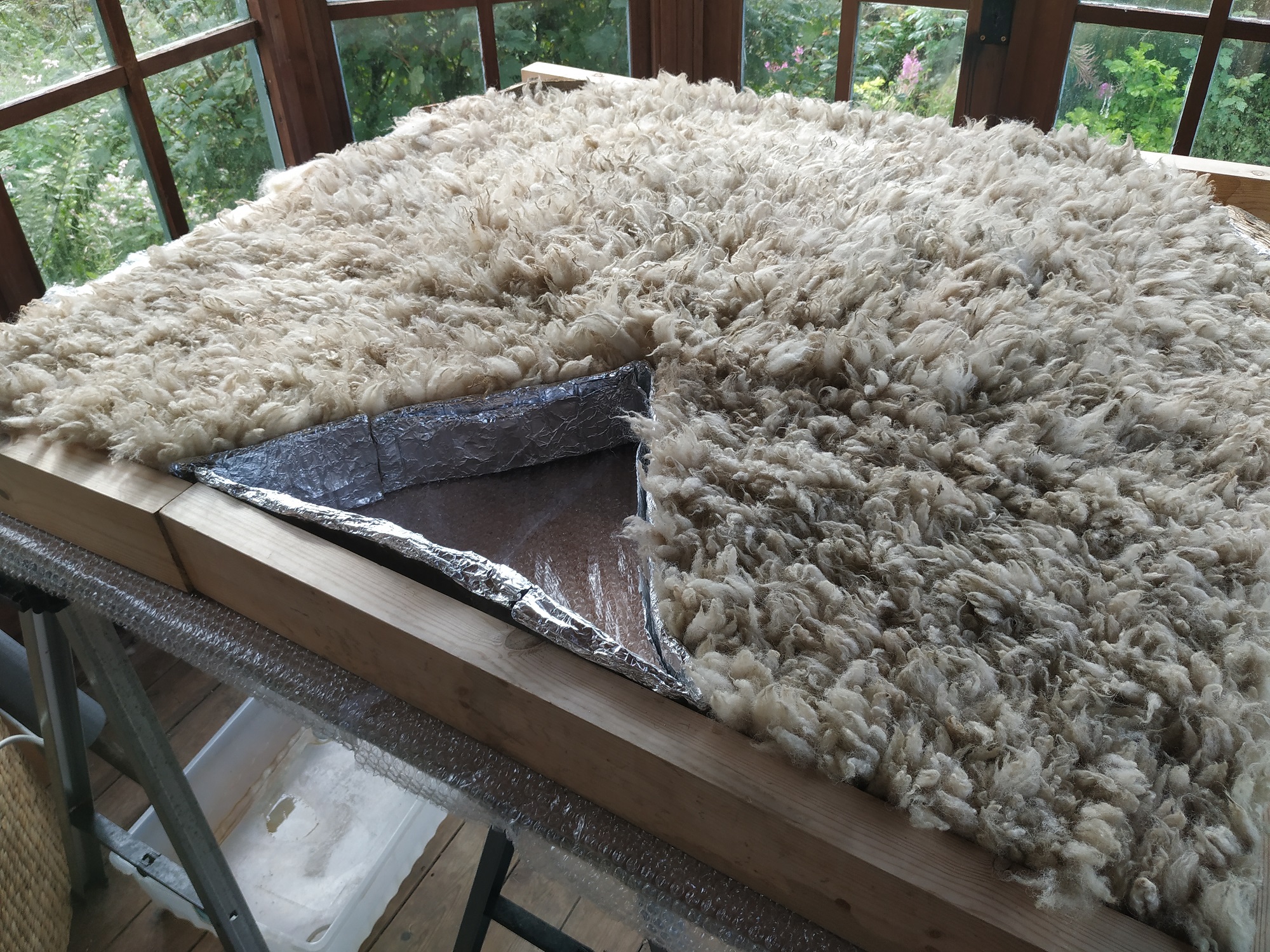 Off I went trailing wool in my wake and Adrian didn’t see me for days as I placed locks of wool, small bunches at a time, until the entire template was completely covered.  It was laborious work, but seeing it grow before my eyes was deeply satisfying, a bit like putting compost on the garden.  You start counting wheelbarrow loads, at first you work out there are 50 more loads to go, and then suddenly you realise there are only 3!!