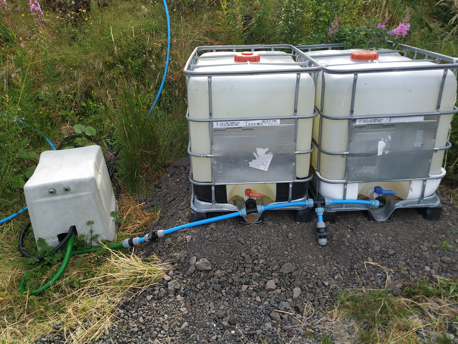 Since we moved here, we have installed sheep troughs fed by natural springs (water system and water system extended) so that the sheep now have water troughs in every field. However, during the summer, these springs dry up and even two tanks containing around 2,200 litres last only a few weeks. So, sometimes we have had to top them up. This used to involve filling a bowser and towing it up with the tractor. Now, we have a pipe that connects the top tank to a pump (housed in the upside down old water tank – see right). This in turn is linked to two bowsers. At the moment, these are filled by pumping water from the river, but the plan is to install a rainwater capture system on our large shed and fill them from that.