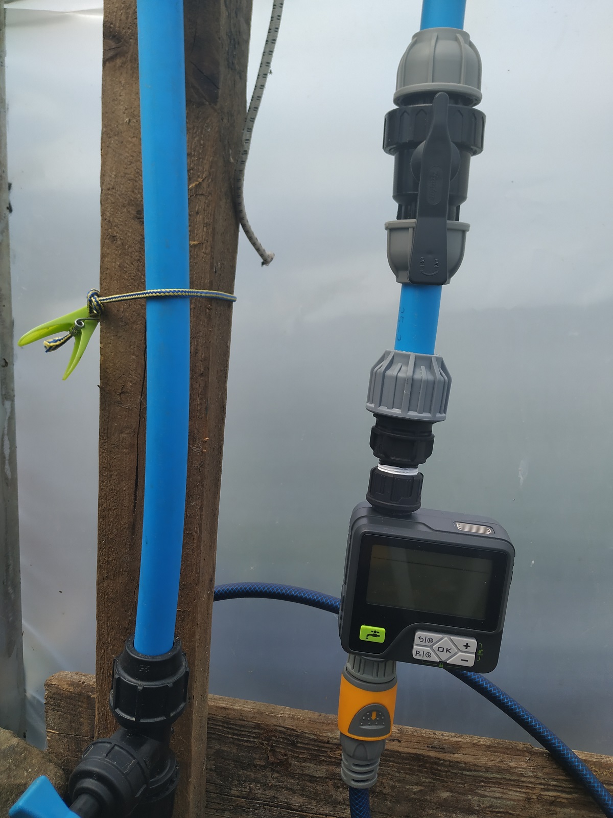 And finally, just to make life a a tiny bit bit easier, we found a really useful gizmo, a watering timer. It opens a valve letting water through for a set time. We had coils of soak hose sitting around doing nothing, so have installed that in the polytunnel and it now waters itself each day for an hour. It saves us a lot of time.