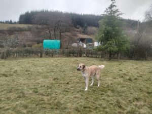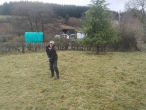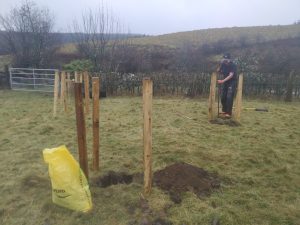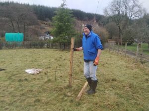 Next, Adrian got to work with the tree guards which entailed banging in 40 stobs with his fence post knocker-inner. It was a hard slog getting them in and we now have a large collection of rocks of all shapes and sizes for dry stone wall repairs.