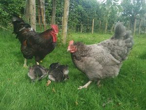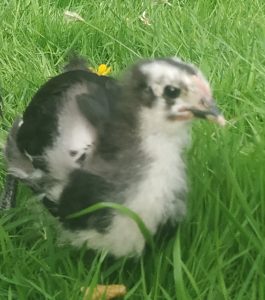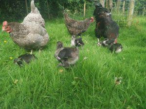 The following evening, it was raining. This time, MMJ decided the coop was the better option. However, two of the chicks had forgotten the way and sat disconsolately under the coop. This caused much scratching of heads. Eventually, I approached and threw a little corn down. They were straight over and were joined by Pepper. Pepper returned to the coop and this was enough to show the chicks the way. Phew!