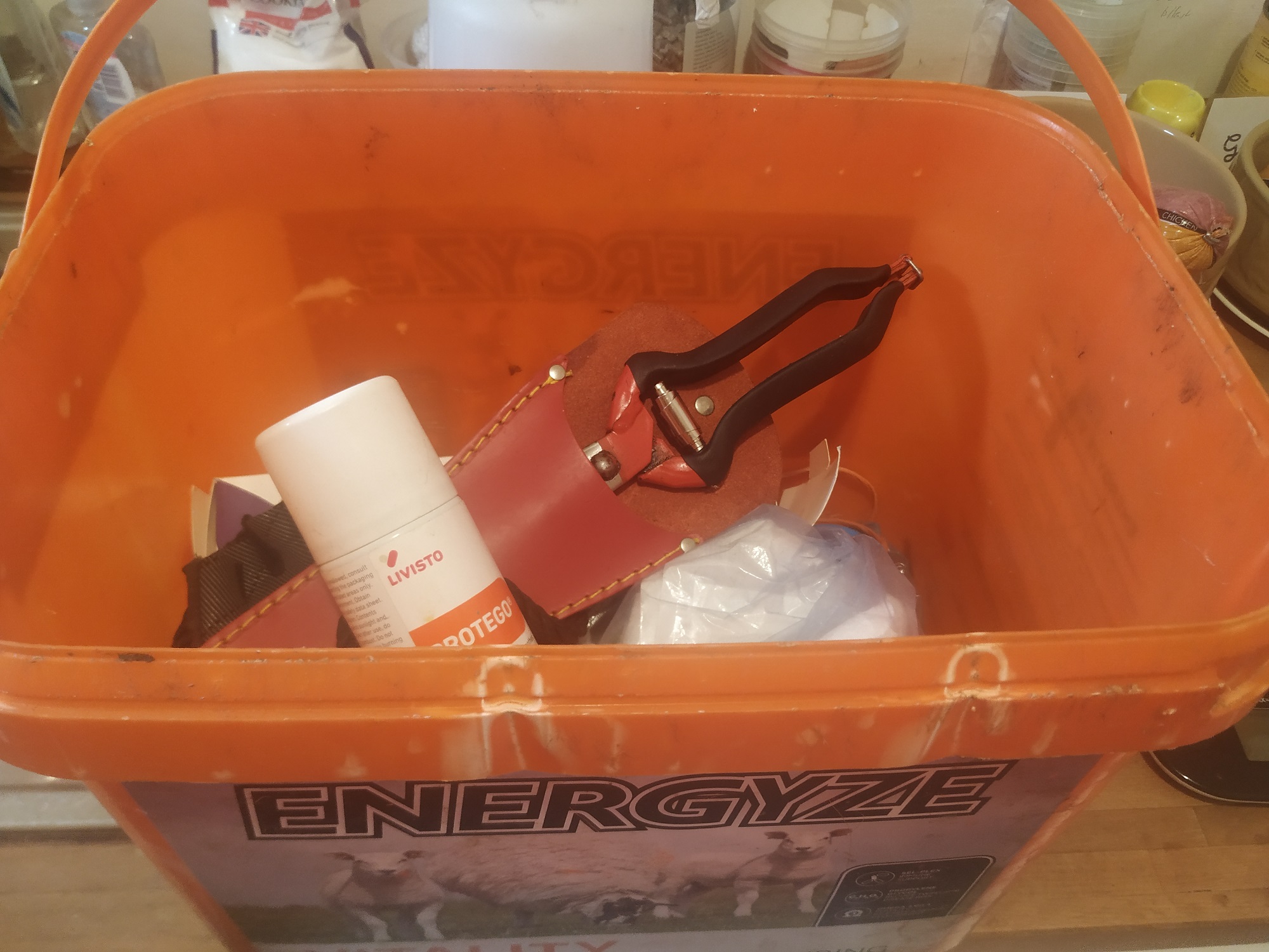 So I chose the one day in the week where thundery showers weren’t forecast and off I went to find Vera with my bucket of bits.  In my bucket I had:  Jakoti hand shears, hoof clippers, Protego wound spray, bailer twine, anti-blister rowing glove for my right hand, plasters, halter, midge spray, midge net, water, a  handful of sheep nuts.