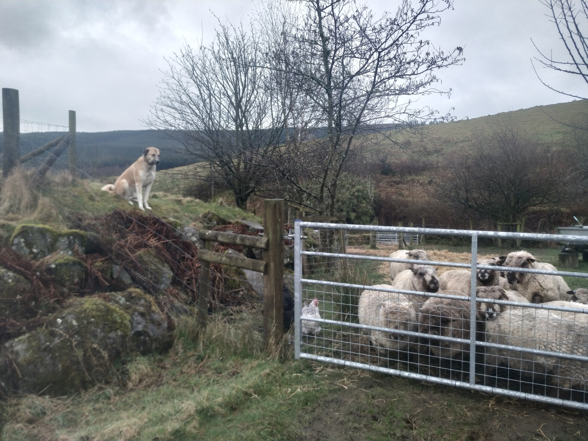 I set off after breakfast with my bucket containing: shears, maggot oil, cotton wool pads, Protego powder spray, nitrile gloves, halter and sheep nuts.  The dogs came with me as they like to hang around with the flock whilst clicking into guard mode.  George and Elliot are both Sheep Guardian dogs, George is a Hellenic Shepherd and Elliot is a Turkish Anatolian and they love nothing better than to mooch around with the flock whilst keeping a watchful eye out for bears and wolves, (the Scottish equivalent of).