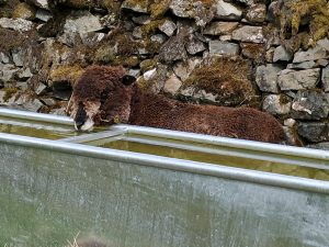 Her condition slowly develops with the advance of summer, and then dwindles with the onset of autumn. During the height of summer, Vera can often be found on her own seeking shelter in the pig ark or the lambing shed, somewhere away from the sun’s rays. Exposure to the sun causes her un-woolled parts to become red and itchy and gets worse after shearing.