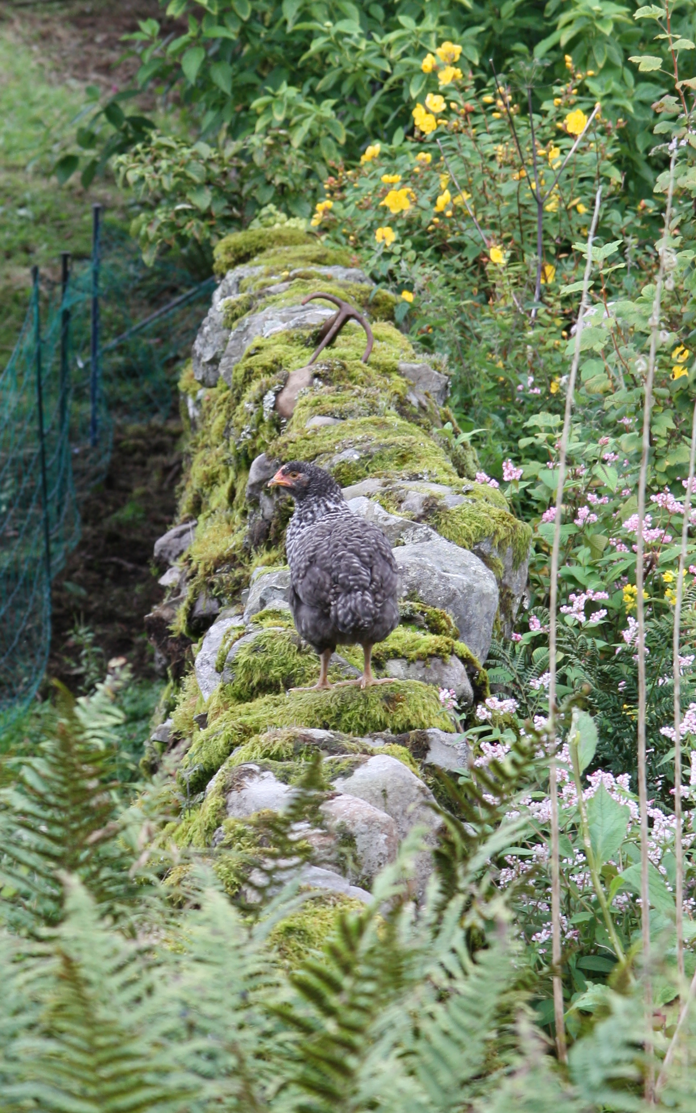 Well, miracles of miracles, all 13 are thriving and turning into proper little hens. They, of course, go everywhere. The netting around the runs does not contain them, nor does the stone dyke that borders a part of the run. Truth be told, Mrs Mills is also partial to a bit of wall hopping herself.