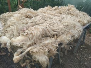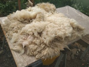 I take a fleece from the large pile in the fleece shed. Then, depending on how intact the fleece is I’ll use one of two methods to turn it into a rug, if the fleece is stretched or broken up, I’ll use “method 1”, if it’s intact, I’ll use “method 2”.