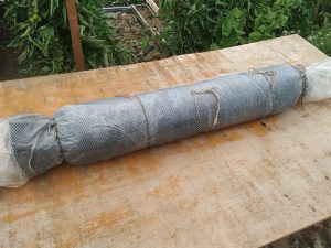Once the locks are laid out I’ll lay a net curtain over the top and drizzle hot water and a small amount of soap over the whole area. Once the wool is wet through (but not completely soaking), I’ll remove the net curtain, replace it with a large sheet of polythene and roll everything up around a broom handle.
