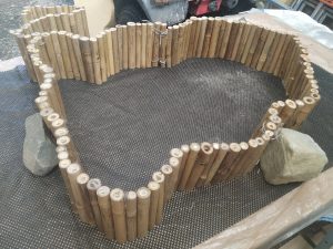 Then, I’ll place lawn edging around the fleece. This works brilliantly for keep everything in place and the edges neat while I’m laying out the carded batts. This is my homegrown method for avoiding raggedy edges.
