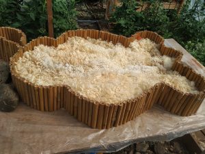 Then I’ll add the carded batts (which will form the base of the rug). Once that’s done I can prepare for the felting part; adding the net curtain, soap, water and so on.