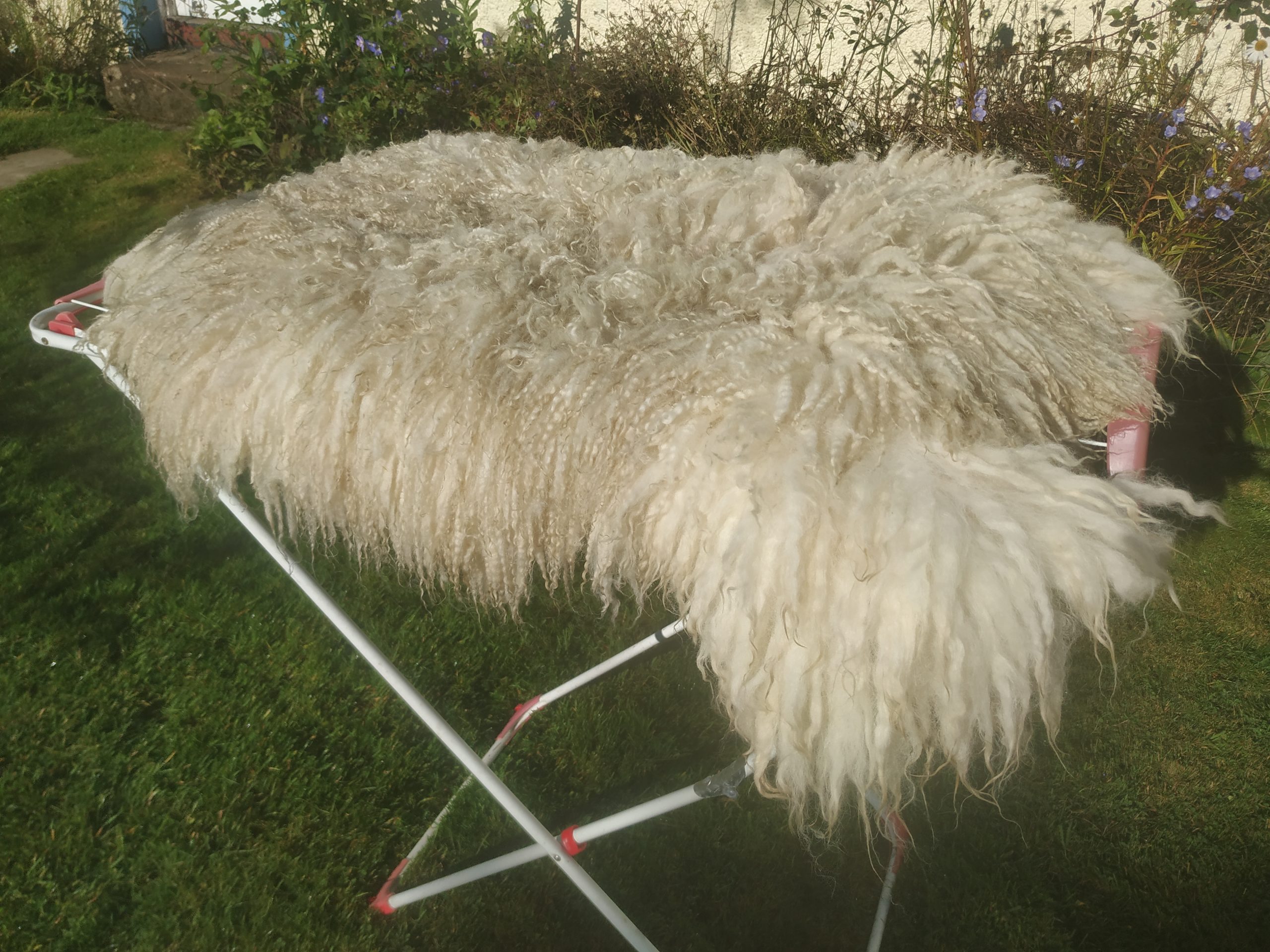 Several rolls (and cups of tea) later, scouring, washing, drying and beautifying I’ll have a felted fleece rug, made using a fleece in its entirety😊