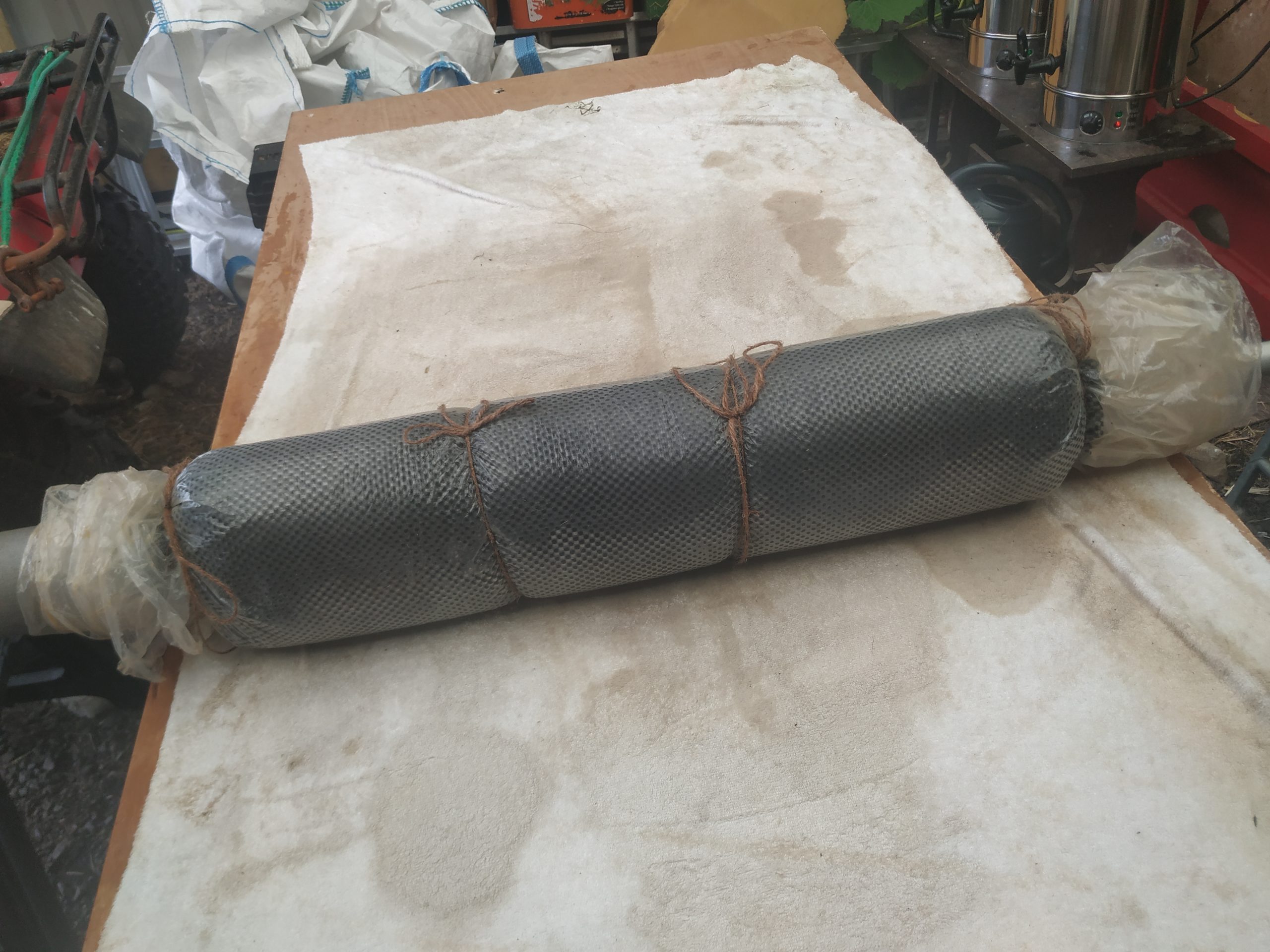 Once the locks are laid out I’ll lay a net curtain over the top and drizzle hot water and a small amount of soap over the whole area. Once the wool is wet through (but not completely soaking), I’ll remove the net curtain, replace it with a large sheet of polythene and roll everything up around a broom handle.