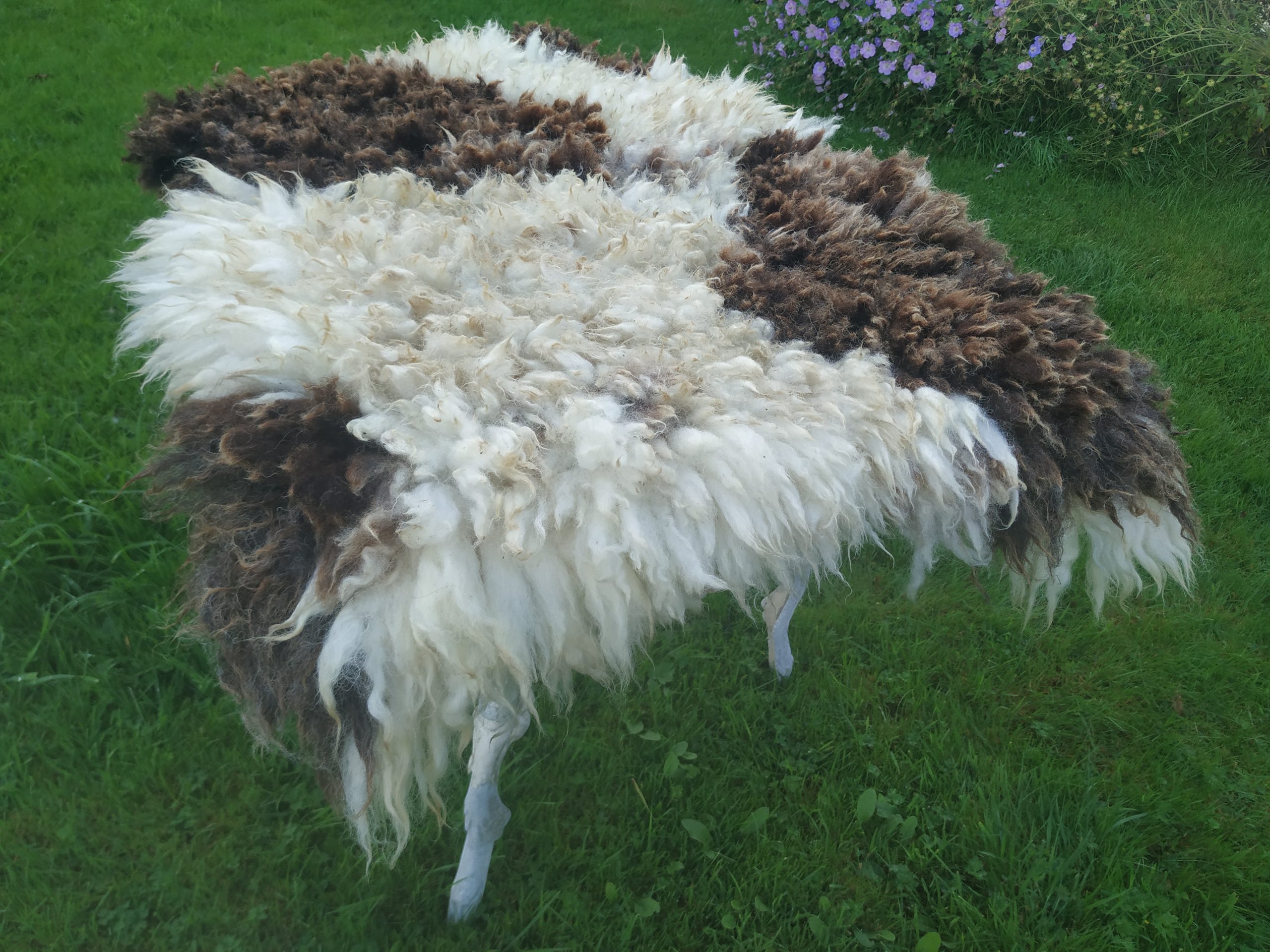 I take a fleece from the large pile in the fleece shed. Then, depending on how intact the fleece is I’ll use one of two methods to turn it into a rug, if the fleece is stretched or broken up, I’ll use “method 1”, if it’s intact, I’ll use “method 2”.