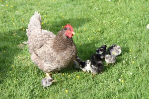 Other than sheep, we also keep six hens and a cockerel who live in the orchard next to our house. These are a happy bunch who spend their time free ranging, pecking around under the apple trees. One of their favourite activities is having dust baths in the lambing shed which happens also to be in the orchard. Our hens breed naturally, mostly every year one of them goes off and hides, then reappears three weeks later with a bunch of chicks. Numbers can vary between one, and a whopping thirteen which we had courtesy of Mrs Mills in 2018. Most of our hens are Mrs Mills’ chicks in fact.