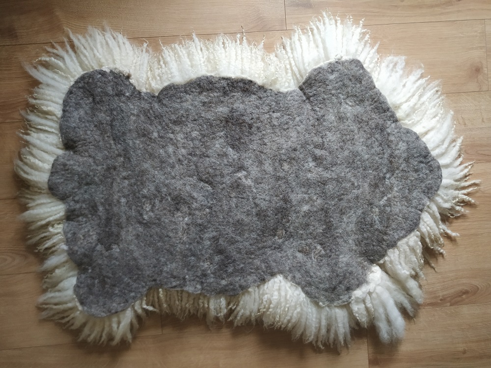 What are felted fleece rugs? Felted fleece rugs are totally “sheep friendly”. No sheep are harmed in the process of making them, hurray! They may look just like sheepskin rugs but if you turn one over, you will see the base of the rug is made entirely of wool, not a hint of hide in sight.