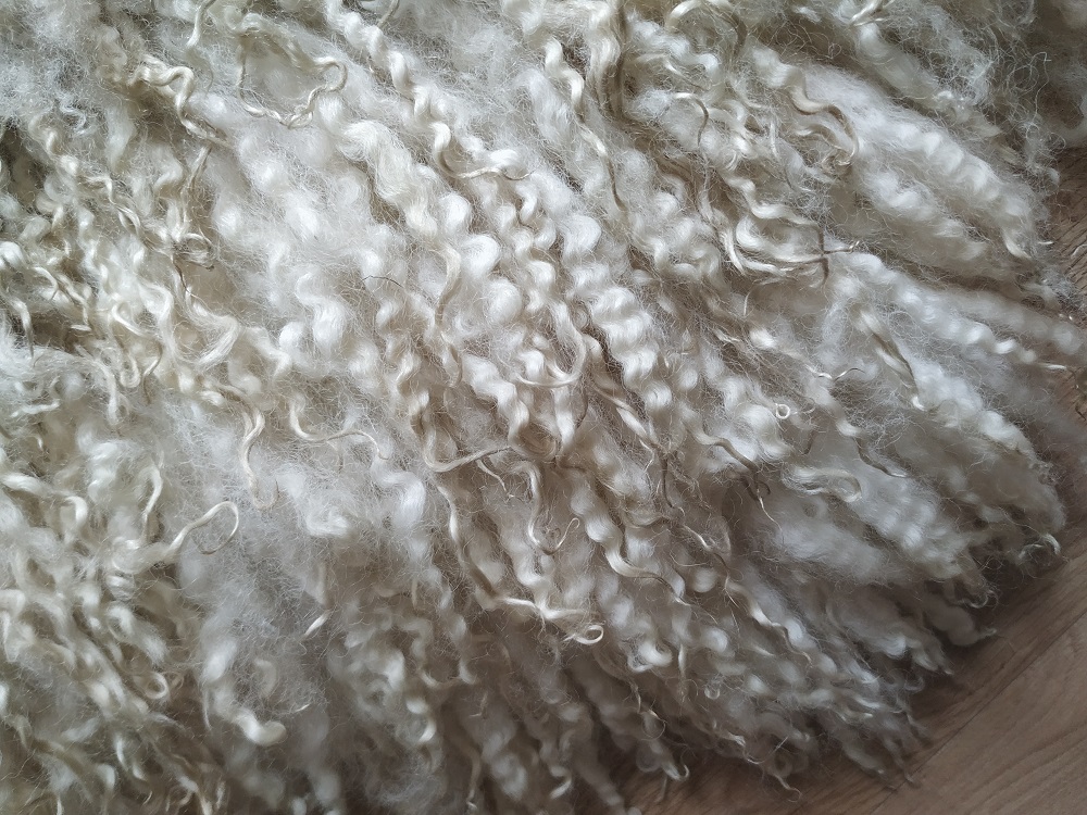 Fleece Description: The wool is pale cream, bouncy and densely packed. The staple length is unusually long on this fleece making the rug seem very glamorous. The locks are curly and at the tip of each lock there’s a little curl which is the original lamb’s wool. Lambs are born covered in thousands of tiny curls which are still there in a hog fleece.