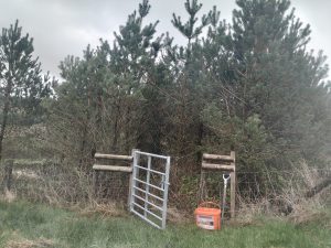Just over two weeks ago we began work on the copse. First of all, Adrian created access to it by way of a wooden gate. This meant banging in a gatepost so we could fix the gate to it.