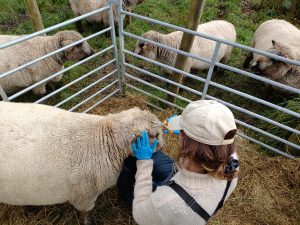 After working on Selene the pen had got all muddy and we were sliding around. It was extremely tempting to scoot back indoors for a cup of tea in the warm kitchen but somehow we resisted. Instead Adrian headed off to the shed and came back with a dumpy bag full of last year’s hay. This made the perfect base for the pen and we were able to crack on and do some more sheep.