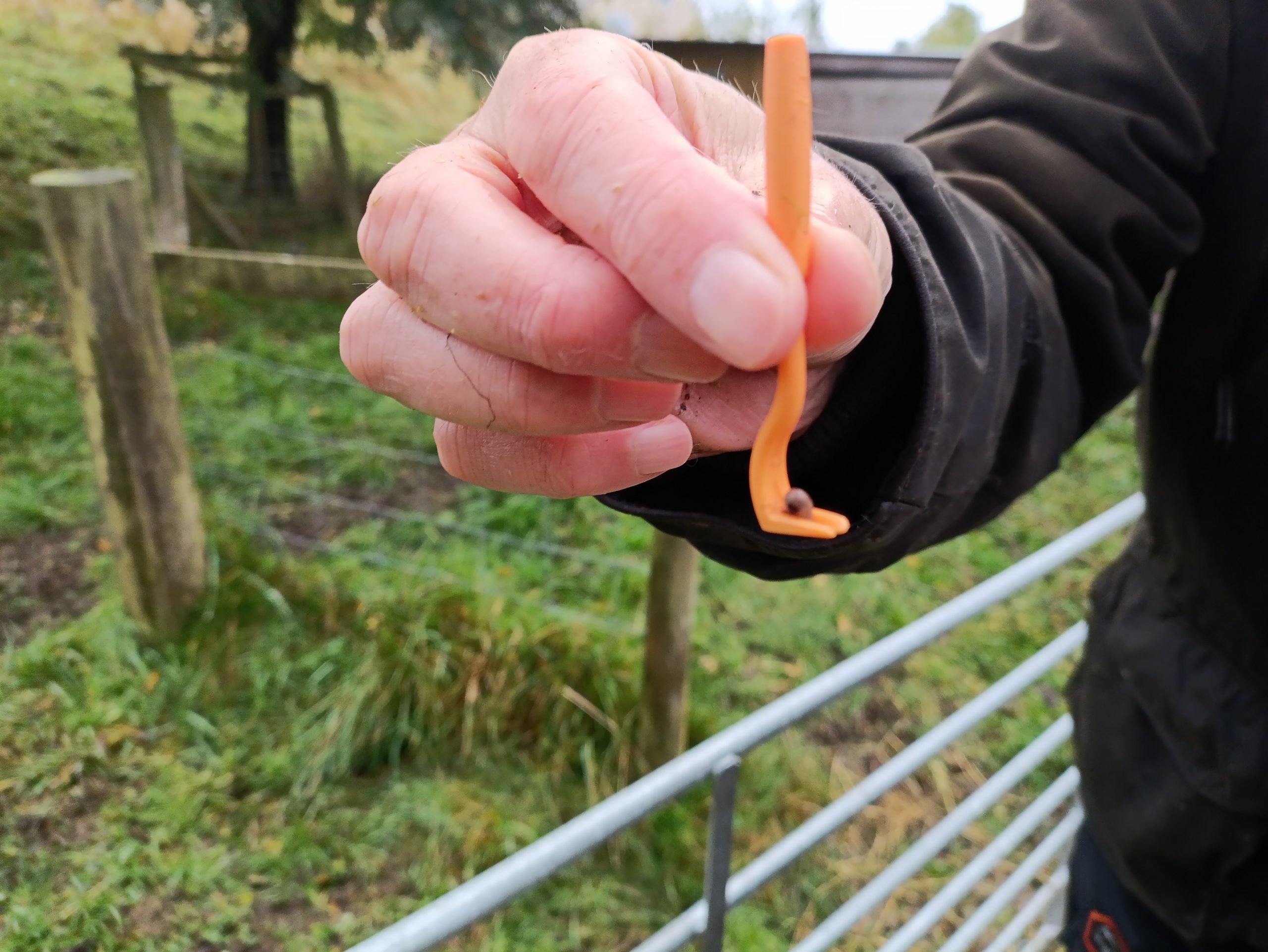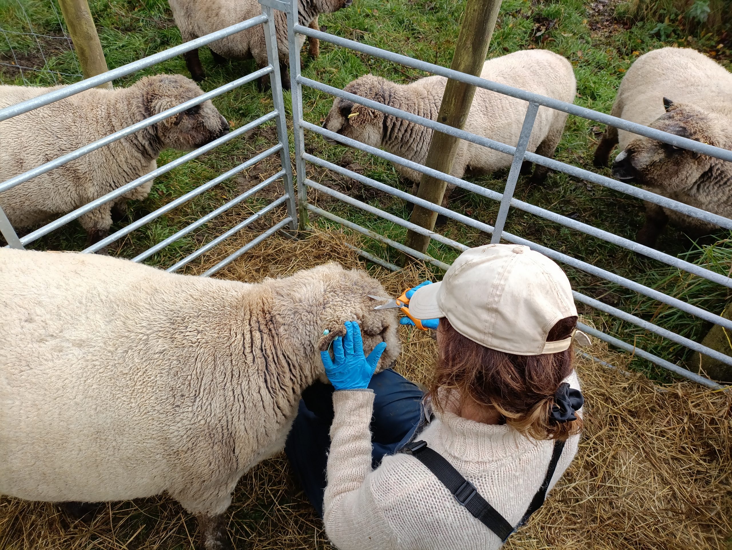 Next we worked on Yaar, he’s our big beautiful wether (castrated tup) with a very friendly nature. Adrian had no trouble at all asking him to follow him into the pen. As I was trimming around his eyes I spotted a tick on his eyelid and sorted that out with my trusty ‘tom tick remover’.