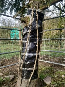 After feeling awful about the fact we forgot to protect our poor tree we quickly got to work. First we put some sheep hurdles around it to prevent further damage, then we googled “what to do”. Now I’m a horticulturalist, RHS trained thank you very much and I do people’s gardens but the truth was, I felt really daft because at that moment, I didn’t have a clue what to do. I had an inkling there was a grafting technique out there for ring barked trees, but I couldn’t remember what the technique was called, let along how to do it.