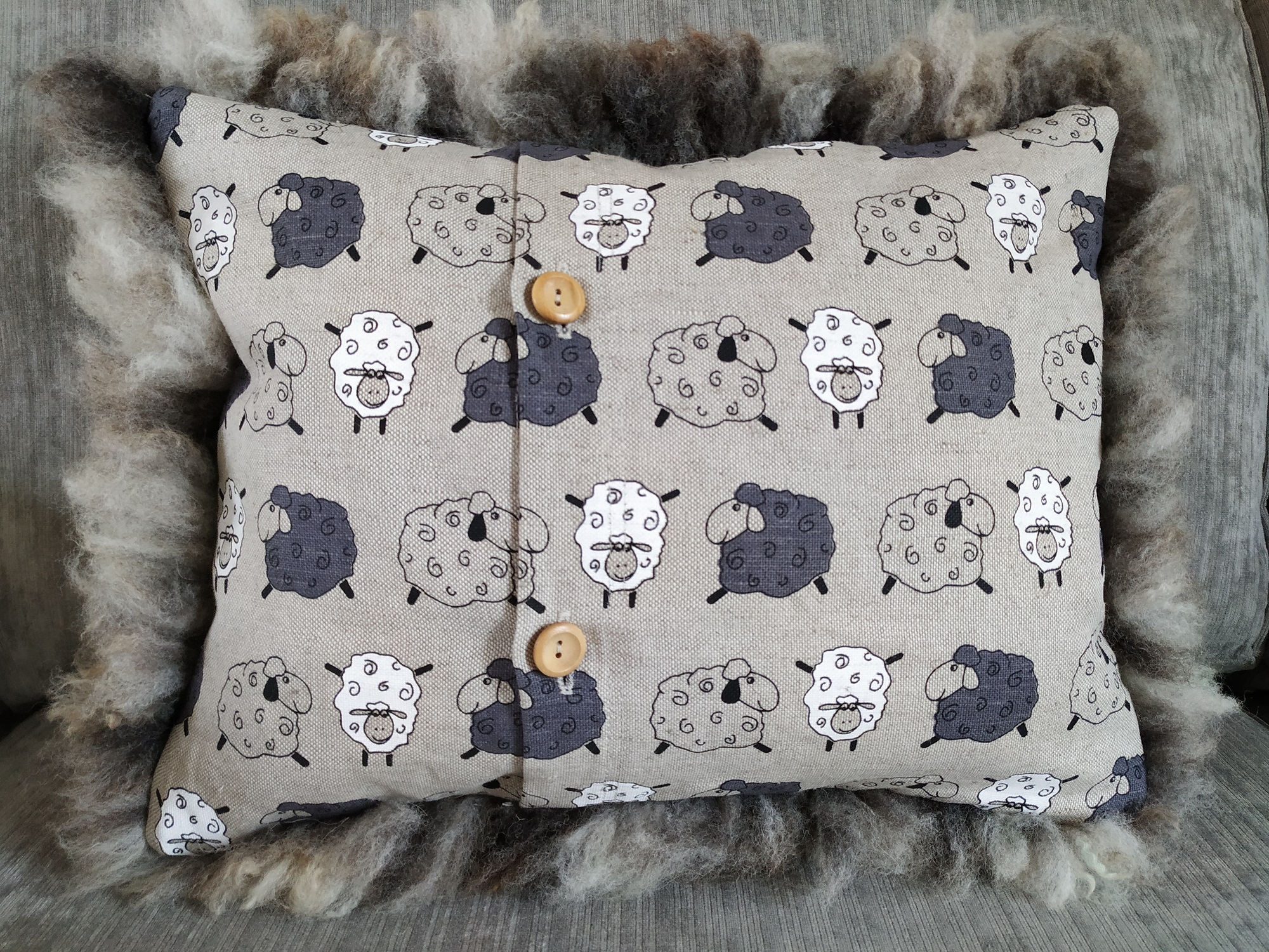 I love natural fibres and feel it is only right to pair our beautiful sheep’s wool with a good quality cotton or linen. I currently offer two options for the backs, “plain” or “sheep”. The plain fabric is Oxford (seeded) 100% cotton in a natural shade. The “sheep” fabric is 100% linen canvas in a neutral shade with a grey and white sheep pattern. The cushion covers are fastened with wooden buttons and the covers are completely removable for washing. For washing instructions please click here.