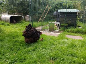 After three days in the nursery run we opened the door to give them access to the wider area. Betty needed space to stretch her legs and have a dust bath. It’s tempting to keep chicks cooped up but we have never done this. We’ve found it’s better for the mum and the development of the chicks to be out with the other hens learning the ways of the world. Chicks learn fast and are very adept at running under their mum’s wings at the first sign of danger. This said, we did spend the whole day watching them. This was mainly to make sure the other hens behaved themselves. Happily Betty’s broody hormones kept the other hens at a respectful distance and there was minimal fuss. In the evening we put Betty and her chick back in the nursery coop where they would be sleeping for the next few weeks.